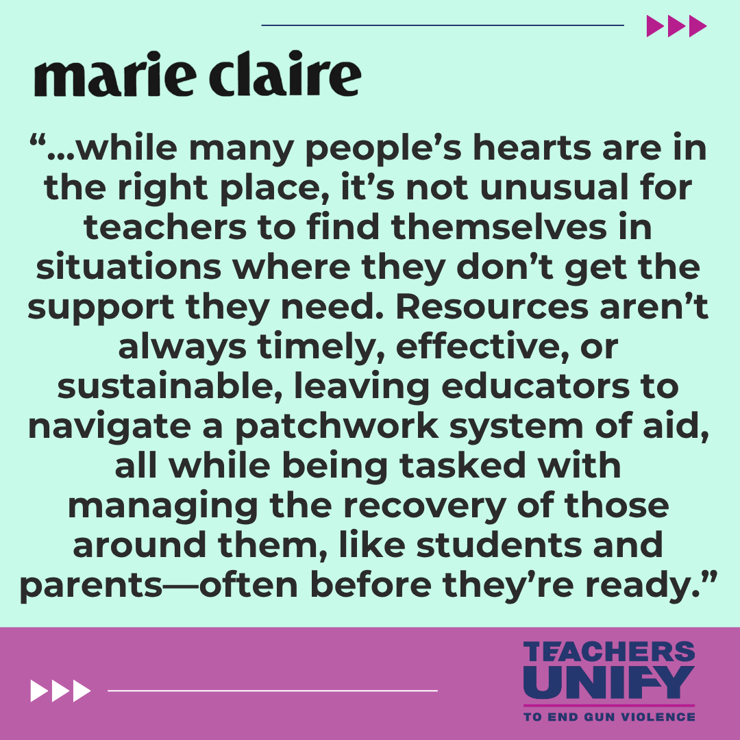 Marie Claire Magazine released a comprehensive, multi‑part series examining the role of women and firearms in America. Teachers Unify is proud to be highlighted in this series’ powerful piece, “No Teacher Left Behind: Mass shootings continue to happen in classrooms at alarming rates. Will the educators ever be alright?”