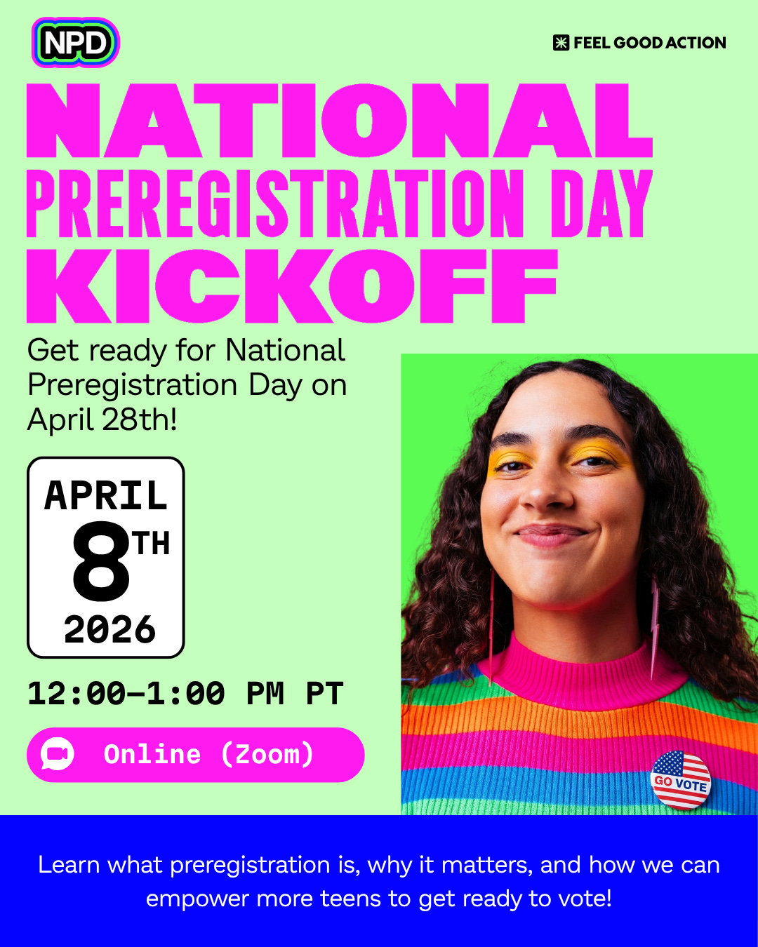 National Preregistration Day on April 28 is a nationwide day of action focused on supporting 16- and 17-year-olds as they take their first step into civic life. Check out the Feel Good Future: Educator Toolkit for Teen Preregistration that provides step-by-step resources to guide students in becoming informed, engaged future voters who can help build safer communities.